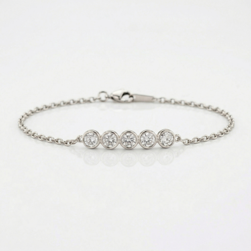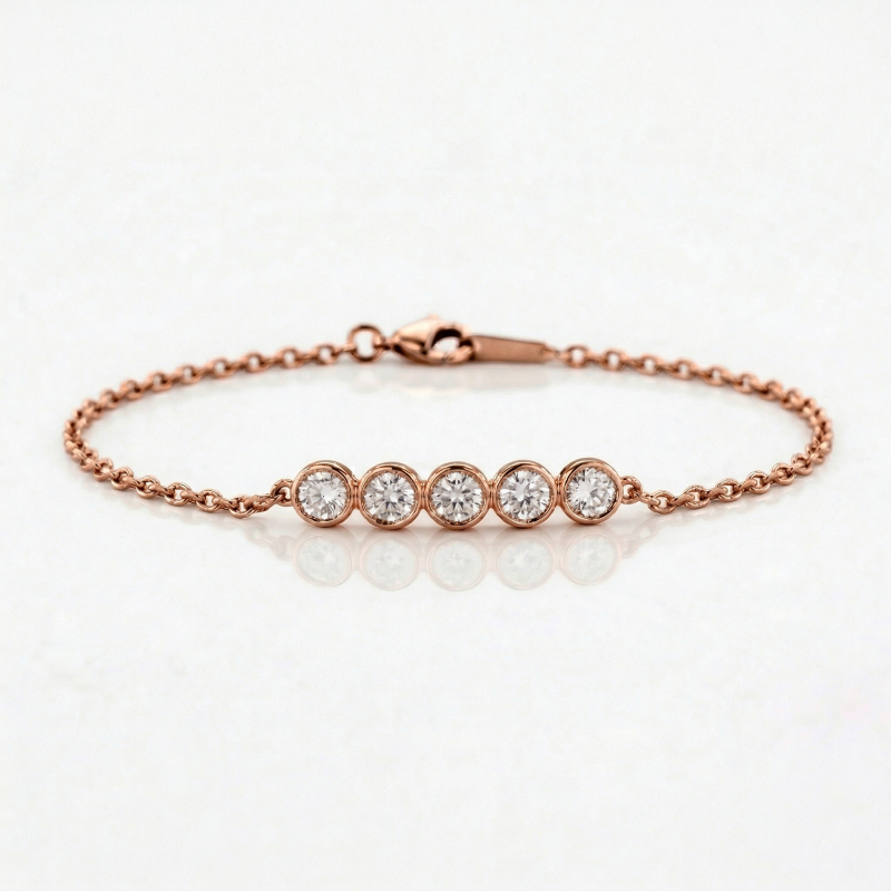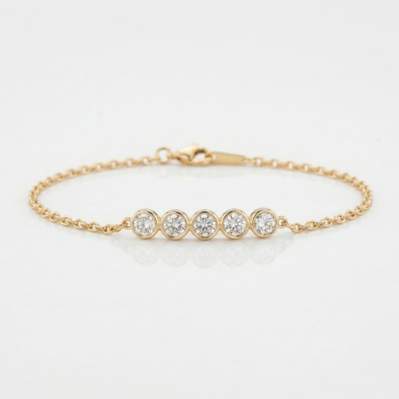 Set with 5 natural diamonds, each weighing 0.15 carats, this bracelet delivers a stronger visual presence than smaller-set pieces while maintaining a delicate profile. Each diamond is secured in a bezel setting, offering a sleek, contemporary look while maximizing durability and wearability.