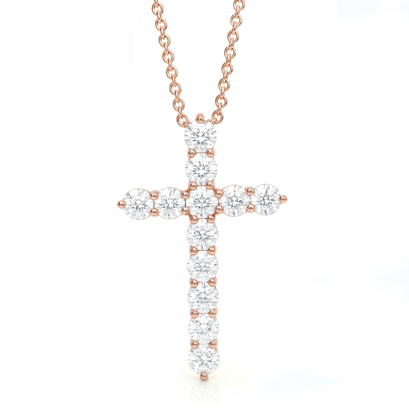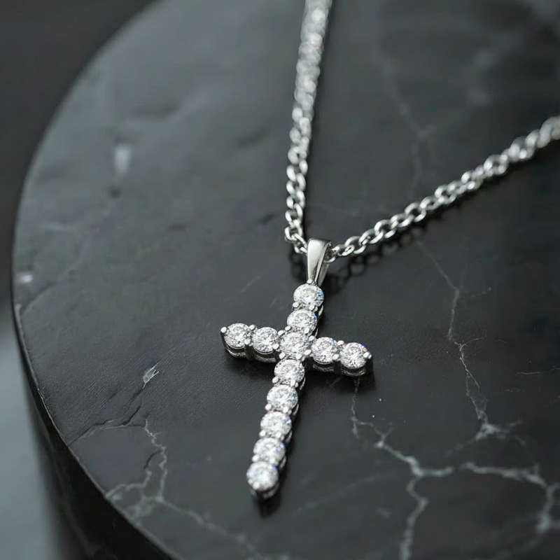 The Diamond Cross Pendant  is a timeless symbol rendered in a refined, contemporary design. Set with twelve round brilliant-cut diamonds, the cross features clean proportions and strong visual balance, offering both presence and elegance. The symmetrical layout and elongated silhouette give the pendant a striking yet restrained character.