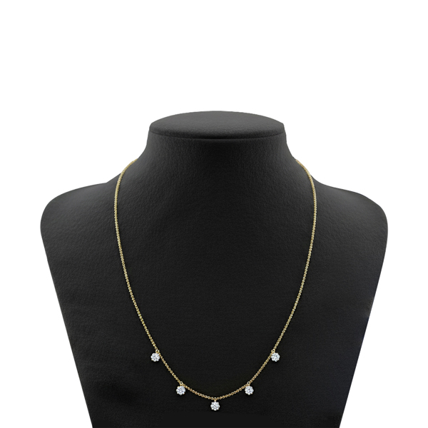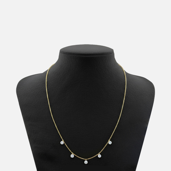 The Five-Stone Diamond Drop Necklace is designed for both comfort and elegance. It drapes naturally along the neckline, secured with a refined clasp for confident wear throughout the day or evening. Lightweight yet substantial, it offers timeless appeal and effortless sophistication.