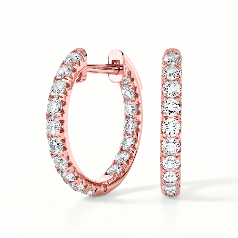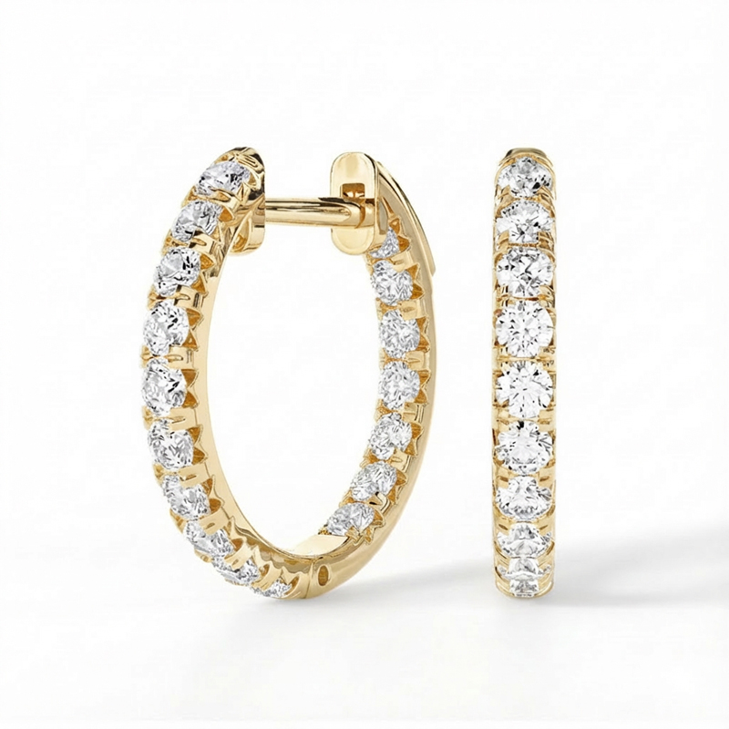 We understand that quality is paramount. Therefore, our inside-outside diamond hoop diamond earrings are available in two exceptional qualities: Premium and Premier. Our Premium collection features diamonds of E-F color and VS clarity, ensuring a sparkle and brilliance that captivates the eye. For those seeking the utmost in diamond quality, our Premier collection offers diamonds of E-F color and VVS clarity, providing a top level of purity and radiance.
