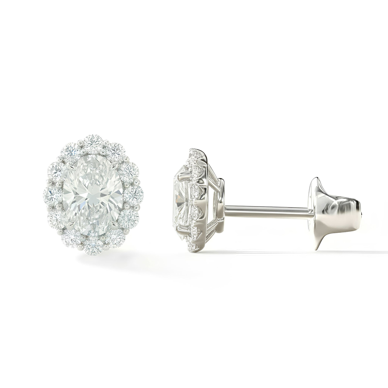 Each pair is set with natural oval-cut diamonds, carefully selected and matched for symmetry, brilliance, and consistency. The halo diamonds are precisely calibrated for uniform sparkle and seamless integration.