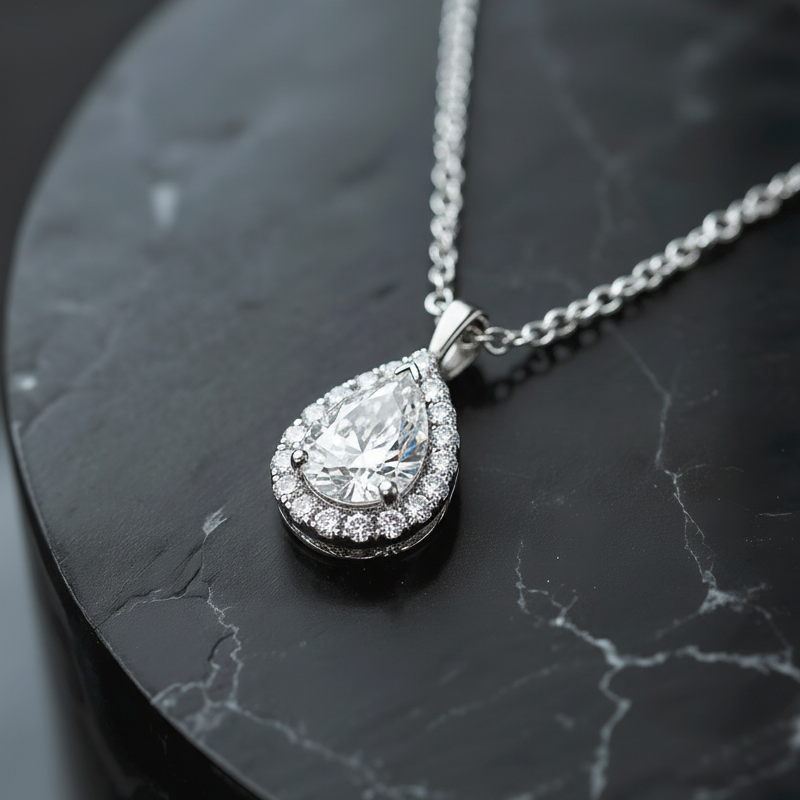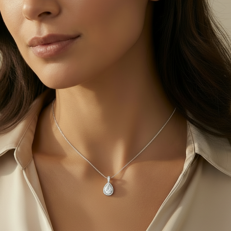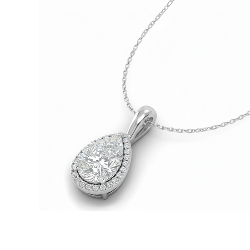 A pear-shaped diamond pendant, crafted in 18K gold and set with a carefully selected GIA-certified 0.50 ct or 0.80 ct diamond in F color and VS1 clarity, encircled by a delicate diamond halo and paired with a matching 42 cm 18K gold chain. A timeless design that highlights the diamond’s natural brilliance.