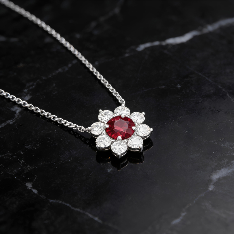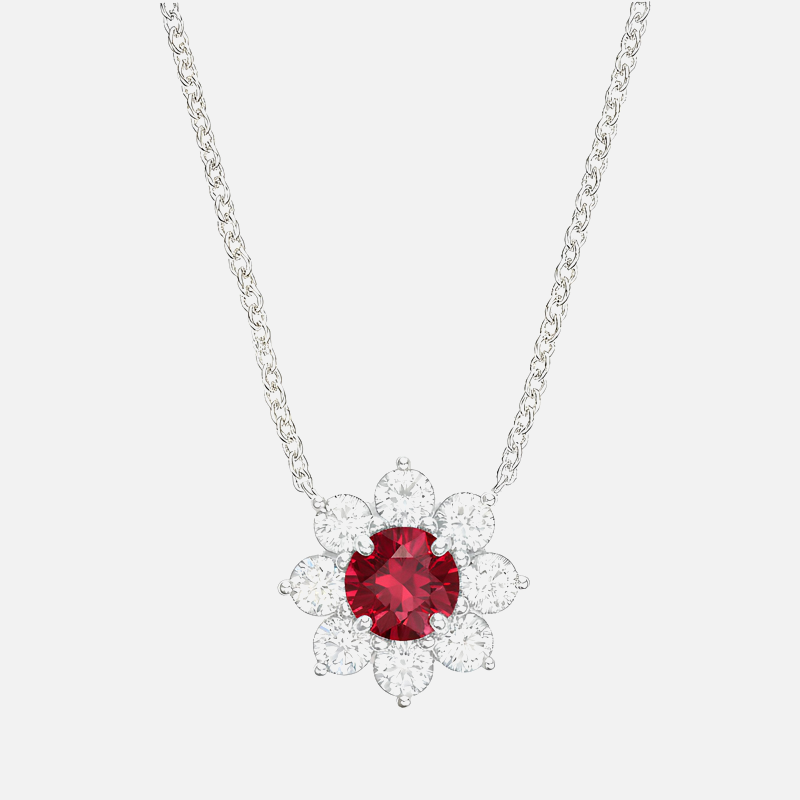 The Ruby Flower Pendant Necklace features a balanced floral composition with a round center stone framed by a symmetrical diamond surround. The proportions are carefully calculated to create visual harmony while maintaining a refined, lightweight appearance on the neckline.