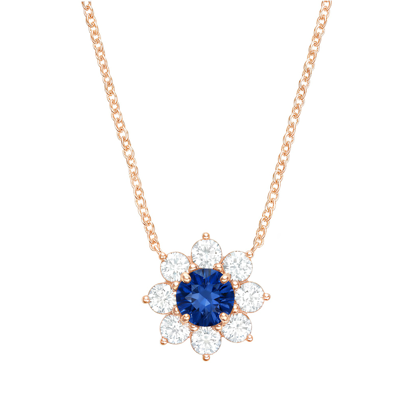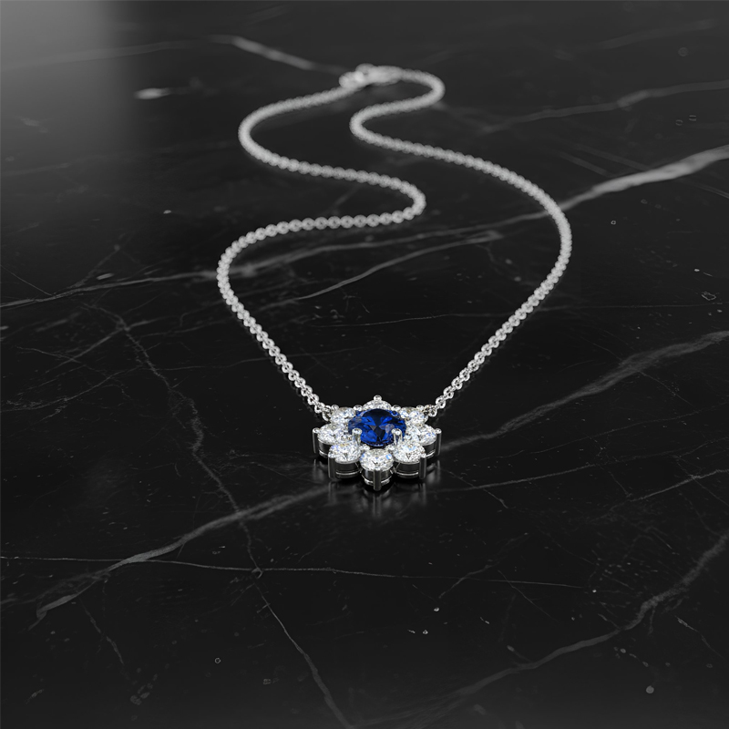 The Sapphire Flower Pendant Necklace features a balanced floral composition with a round center stone framed by a symmetrical diamond surround. The proportions are carefully calculated to create visual harmony while maintaining a refined, lightweight appearance on the neckline.