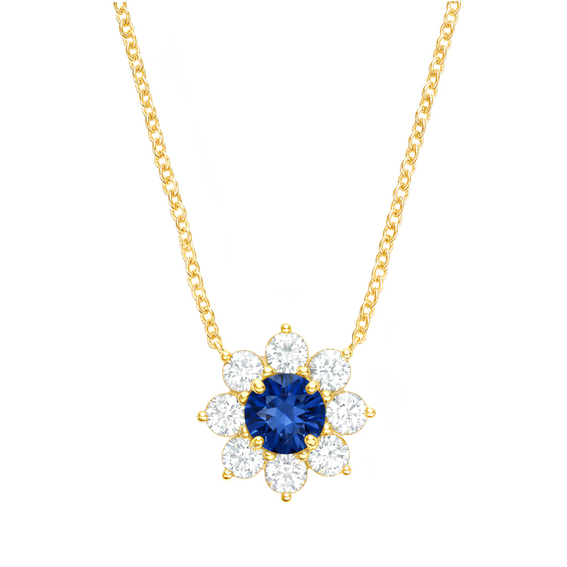 The Sapphire Flower Pendant Necklace features a classic floral design centered around a vivid blue sapphire. A round-cut sapphire sits at the heart of the pendant, surrounded by eight round brilliant-cut diamonds arranged like petals, creating a balanced and elegant composition.