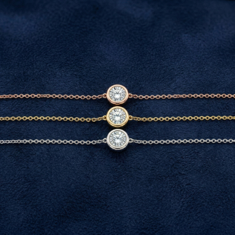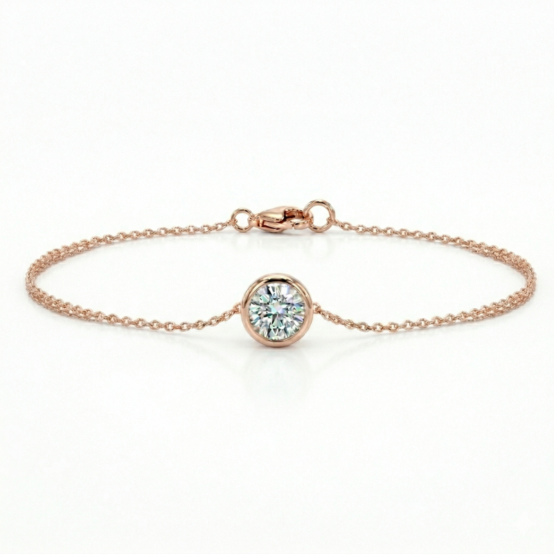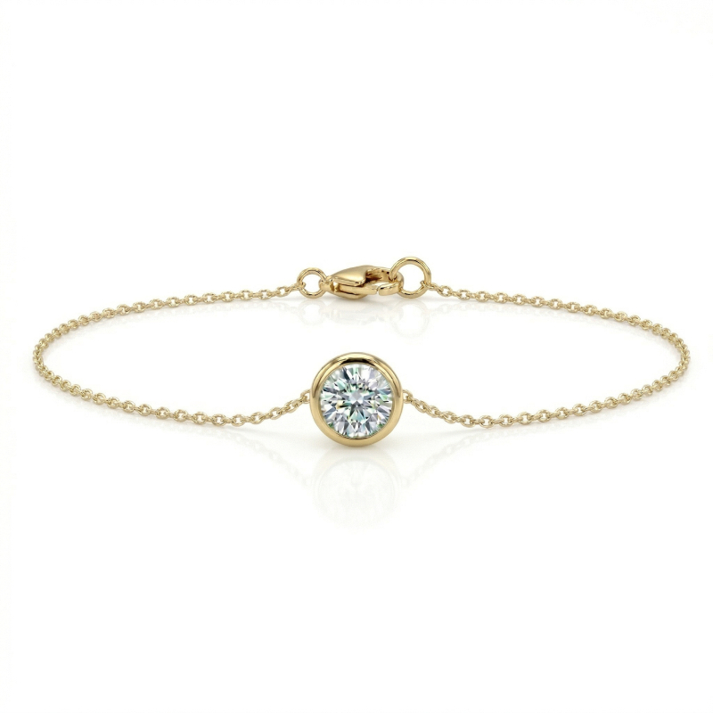 The Solitiare Bezel Diamond Station Bracelet is set with a GIA certified 0.50 ct. natural diamonds, the bracelet showcases delicate brilliance with a refined and harmonious design. The solitiare diamond is secured in a bezel setting, offering a sleek, modern look while ensuring both durability and comfort for everyday wear.